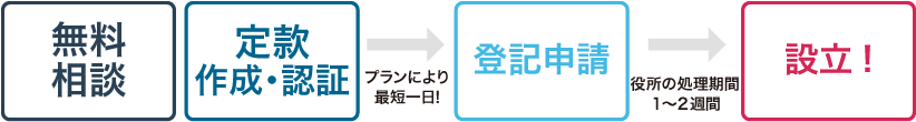 お急ぎの方は合同会社であれば最短午前にご依頼いただき、その日の午後に設立も可能。株式会社の場合は定款認証の手続きで公証役場の都合もありますが、1~3日程度で可能。※レギュラープラン以上は提携司法書士が登記申請をご指定の日に行います。登記日が会社成立日です
